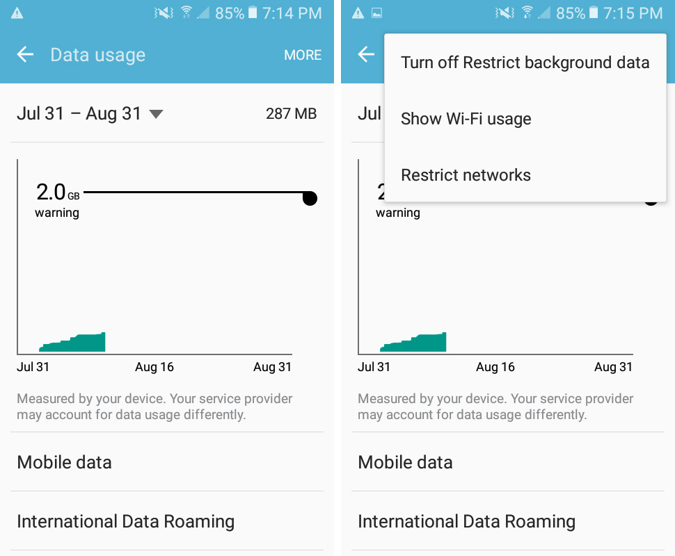 Restricting background data stops apps from working when not connected to Wi-Fi. It essentially turns off auto-syncing with apps like Gmail and Facebook, meaning you won't get notifications from such apps unless the app is being used at the moment or you're connected to a Wi-Fi network. For example, you won't see a new Gmail message unless you open and refresh your Gmail app. However, phone calls and messages will still go through regardless of Wi-Fi status. To access Background Data Restriction, go to Settings > Data Usage > More > Turn on Restrict background data. Once turned on, a warning triangle (see screen capture) will appear in the notifications bar. This might get irritating especially when you consistently have the notification showing on the lock screen and notifications bar, so press and hold the notification to hide it where you prefer not to see it.
